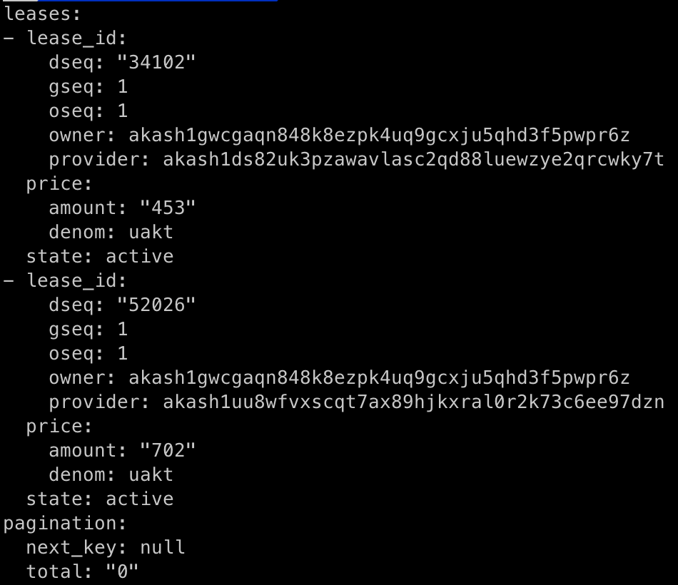 lease 的输出结果应该如下,会有不同的 dseq,provider 可能不同,需要重新赋值: