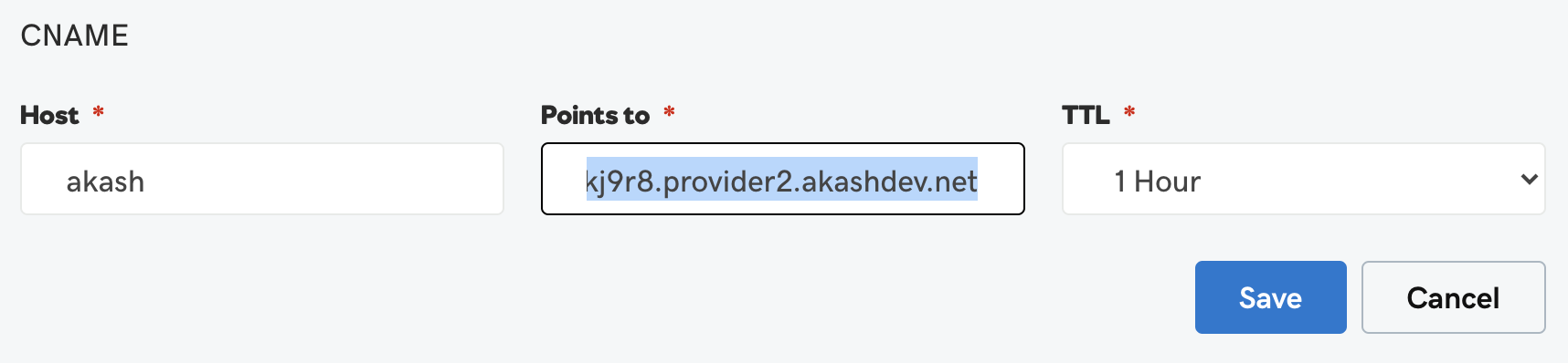 去域名供应商处,把域名的 CNAME 指向 akash 分配的地址: