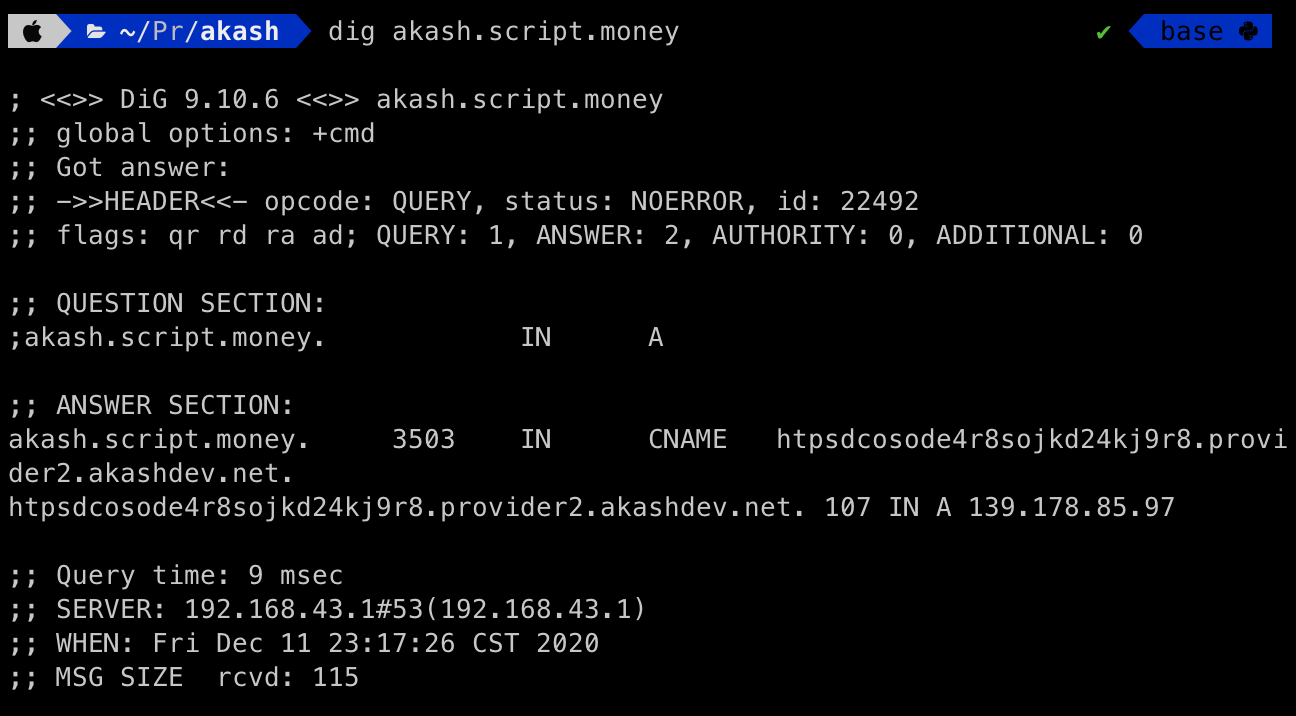 等待一段时间,域名解析服务刷新后,用dig命令就能看到已经正确指向了 akash 地址。